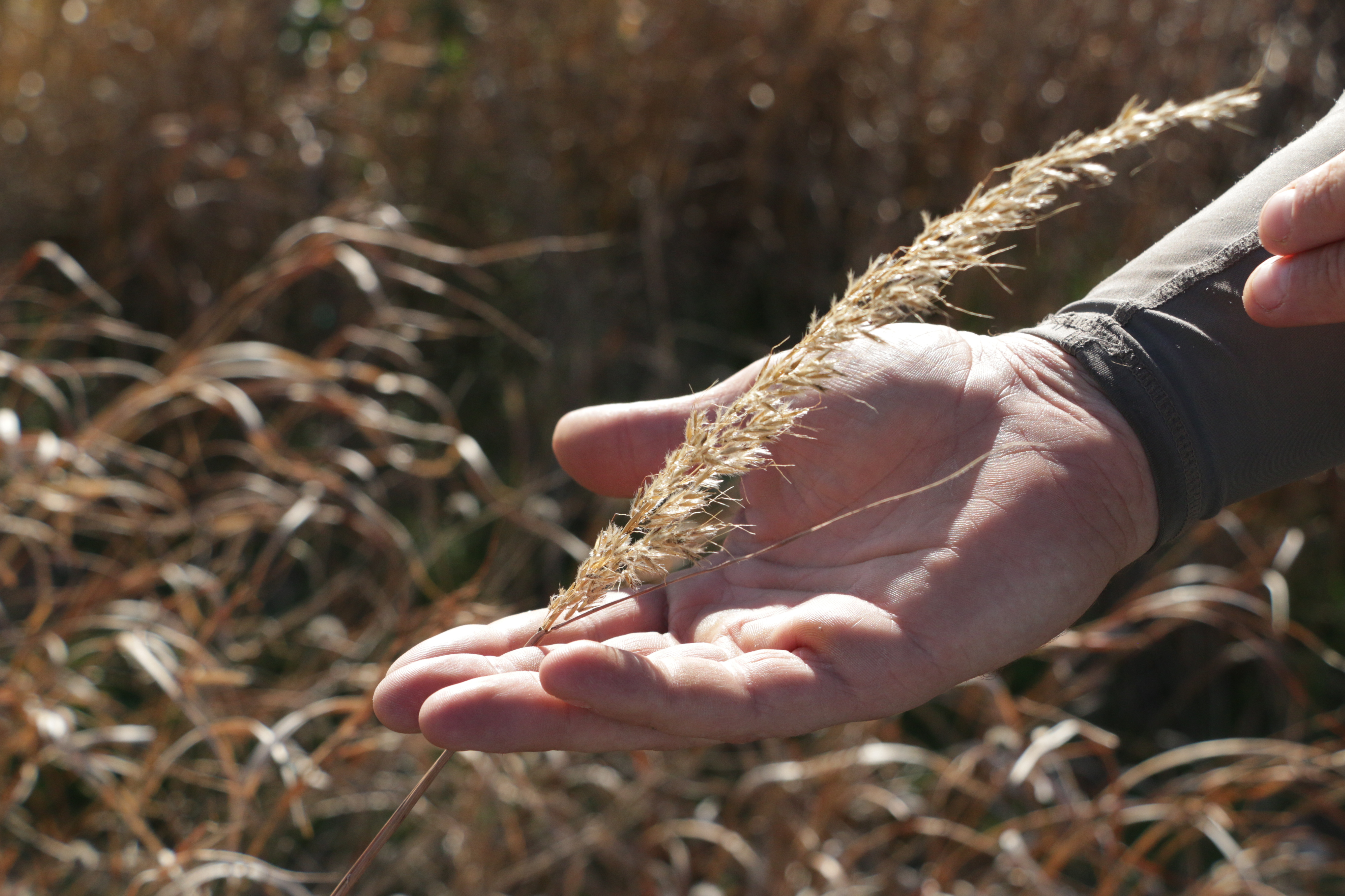 The next step in regenerating soil is finding a cover crop to rebuild resistance to erosion. "The native [grasses] will take up to three, even five years to start germinating after you've cast them on the ground following the pigs and/or chickens," Tina explains. So a "nurse crop" is necessary. James Brown, owner of Barton Springs Mill, provides Tina and Orion with heirloom seeds he can't use, called "overs" and "unders" (over/under the correct size for his mill). When he approached them, Orion says, "everything crystallized for me. Because if you have land that has been overgrazed by cows and goats for 50 years, it doesn't have the microbiota life to cycle the nutrients in the soil anymore, even if you try to put nutrients on it. So I thought, I can use these overs and unders as nurse plants for the future native [grasses], because they will start to punch their roots down and create these channels that infiltrate water into the soil and produce sugars that get the life cycling again."